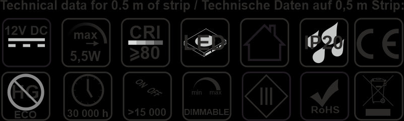 Technische Daten auf 0,5 m Strip: 30 LED, 5,5W, 550 lm, IP20
